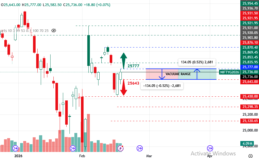 Based on current technical structure, momentum indicators, and price action behavior, Nifty Future is expected to trade within a defined range in the early part of the session. The projected intraday range for Wednesday stands between 25,777 and 25,643.
