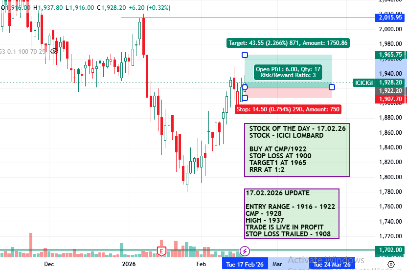 ICICI Lombard, selected as the Stock of the Day for Tuesday, delivered encouraging performance in line with expectations. The stock provided a buying opportunity near the opening range between 1,916 and 1,922. Buying interest remained strong throughout the session, allowing the stock to touch a high of 1,937 before settling at 1,928. This trade remains positional and active. To protect profits and reduce downside risk, the stop-loss has been trailed to 1,908. This adjustment has improved the overall risk-reward profile to approximately 1:3, allowing traders to hold the position with greater confidence. From a technical standpoint, the stock continues to display healthy momentum and favorable structure, indicating the possibility of further upside in the coming sessions.
