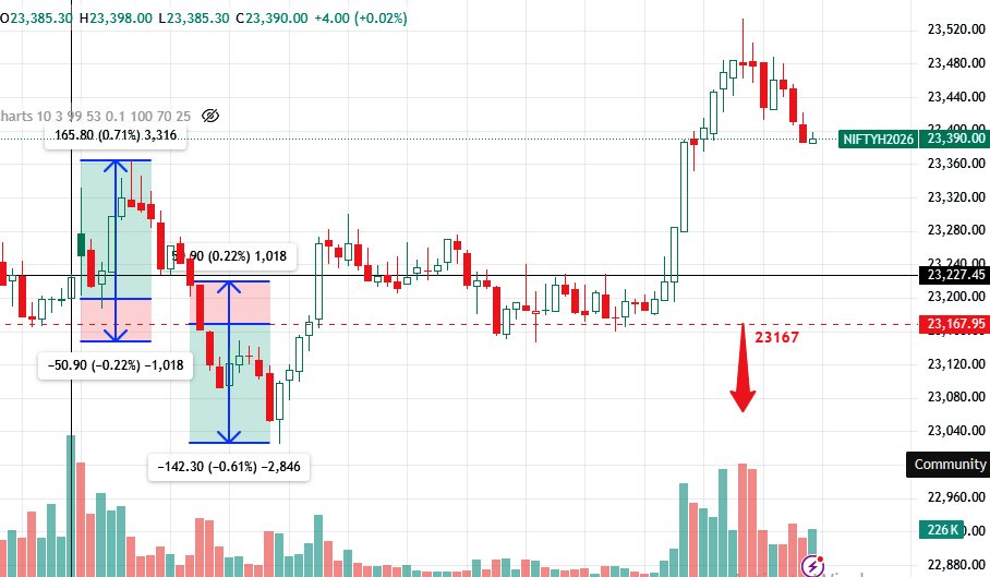 If Nifty Futures begins to trade decisively above 23,499, the market may enter a bullish momentum phase. Under such circumstances, a long momentum trade may be considered with a disciplined stop-loss of fifty points and a minimum target of one hundred points.