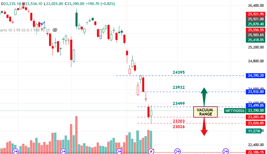 If Nifty Futures opens within the predefined vacuum range of 23,499 to 23,203, traders may observe the behaviour of price within this zone before initiating any position.