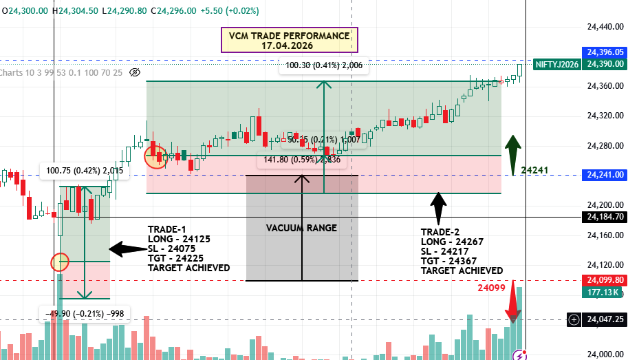 Within the first few minutes of trade, Nifty Futures entered the identified vacuum range and started moving downward with momentum. The early weakness pushed the price toward the lower boundary near 24099. This was a crucial level from a demand perspective, and as per the plan, a buying position had already been placed slightly above this zone with a limited risk.