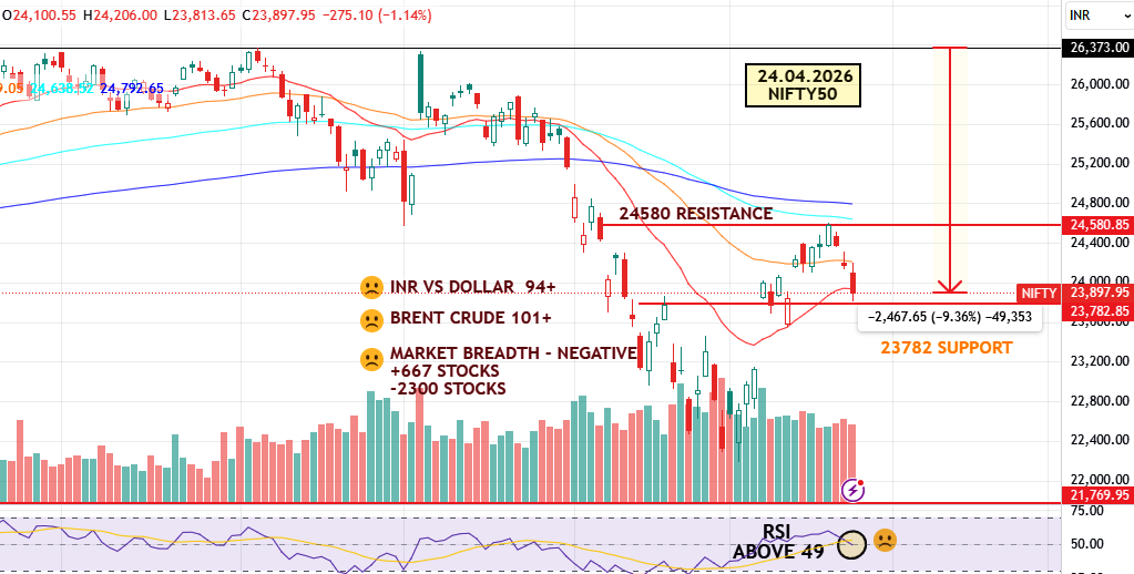 The index managed to take support near the 23782 level, which acted as a short-term cushion towards the end of the session. However, other indicators are beginning to reflect caution. The Relative Strength Index (RSI) has moved below the 50 mark, which generally suggests that momentum is shifting in favour of sellers.